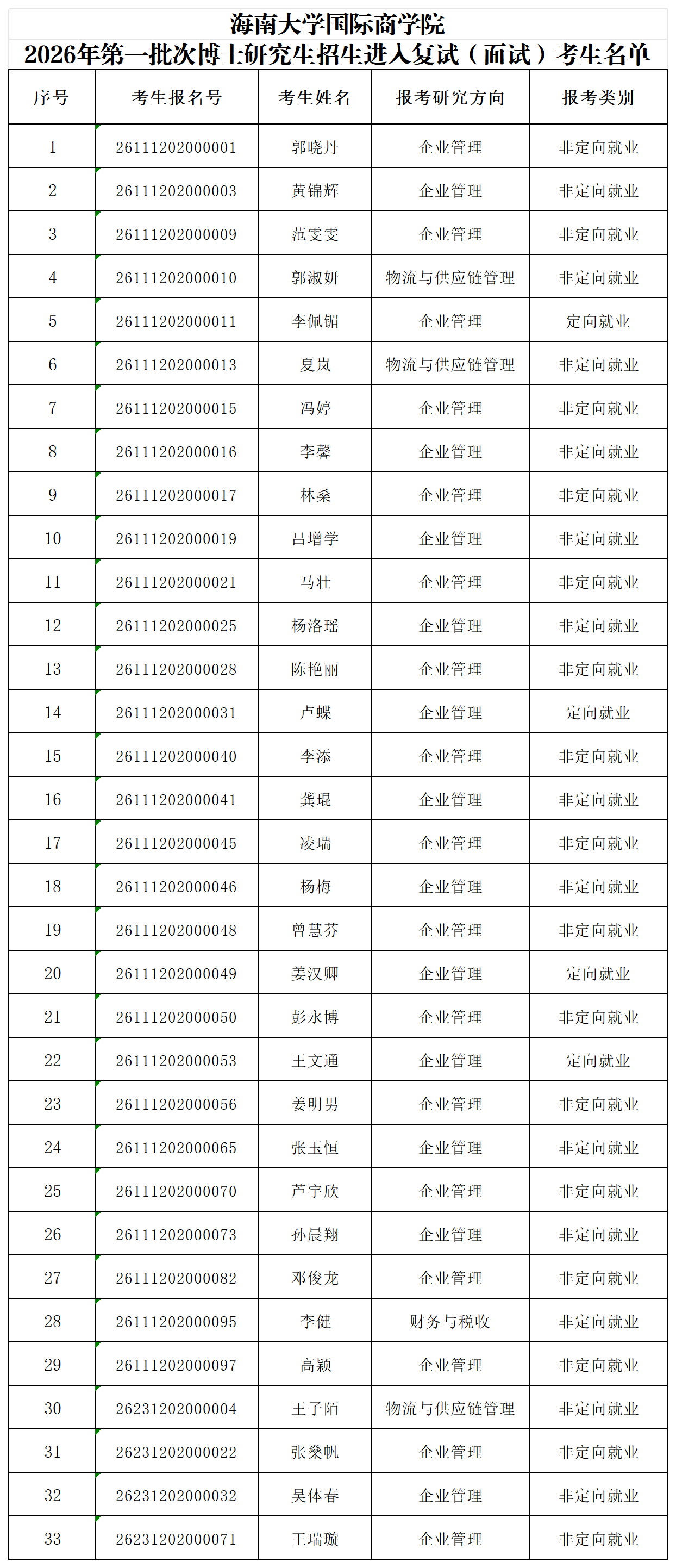 经学院组织资格审查和初试(笔试)考核,2026年第一批次博士研究生招生进入复试(面试)环节的考生名单如下。