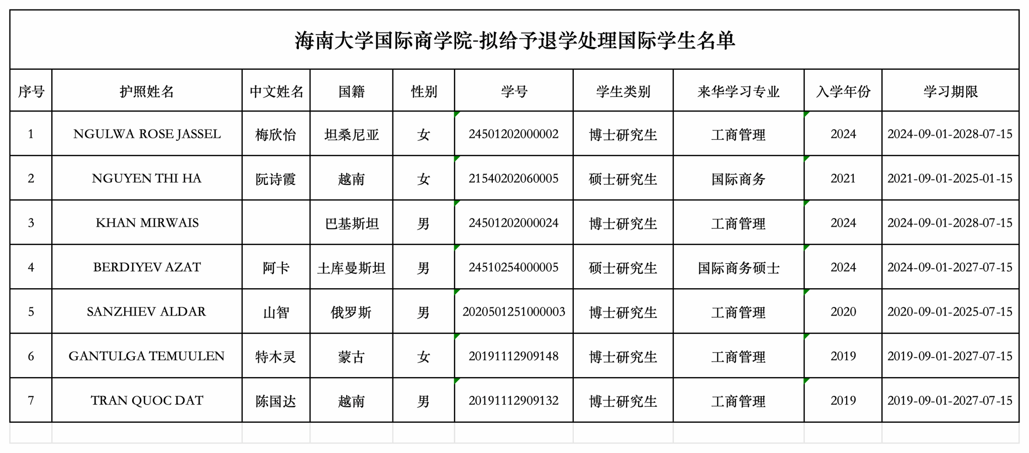 研究生学籍管理规定(修订)》(海大党政办〔2023〕56号)第三十二条关于研究生退学管理之规定,对拟清退国际学生进行公示,具体名单如下: