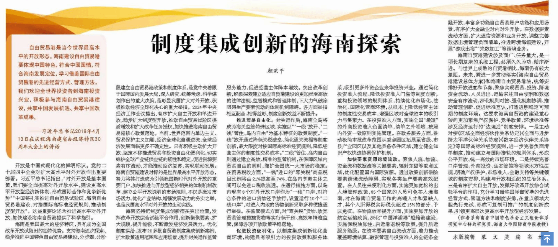颜洪平教授的理论文章《制度集成创新的海南探索》在《经济日报》理论版重磅发表。该文立足海南自贸港建设实践,系统阐释制度型开放的“海南路径”,为我国高水平对外开放提供了重要理论参考。